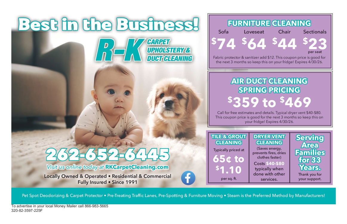 R K Cleaning is a Kenosha business and offers both local and extended carpet cleaning service to those in our area.